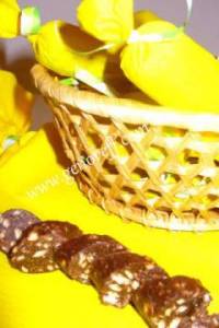 Рецептата е съвременна. Доста време търсих стара изпитана рецепта. Знаете, че старите рецепти са добри, дори много добри. Но това търсене продължи толкова дълго, че се отказах. Потърсих информация в интернет. Така попаднах на една от рецептите на Юлето, която ми се стори добра предвид съставките – всички ги обичам. Това ми беше достатъчно за да реша да я направя. Останах очаравана! Тук е мястото да и благодаря за страхотния вкус. Започнах да я правя доста често, почти докато ни омръзне :). За това и реших с такава вкусотия да изненадам приятелка. Сладкия салам оформих на малки части. Реших,че така ще е по-удобно за побиране в плетено панерче. Завих ги като бонбони, но не бяха с техните размери. Подаръкът беше книга на любим автор, а мини саламчетата просто вкусно допълнение. Ако попитате за повод – ами нейния рожден ден.