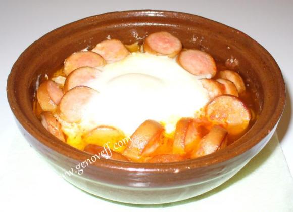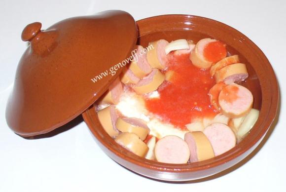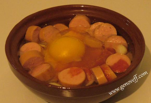 На дъното на гювечето слагате доматения сок. След него плочката сирене, до нея нарязания на кръгчета кренвирш, скилидките чесън и нарязания лук на ленти. Отгоре добавяте яйцето, поръсвате с малко сол и поливате с мъничко олио. Така приготвеното гювече слагате в студената фурна и тогава включвате на 220 градуса. Запича се около 30-40 минути, ако искате яйцето да е по-рохкаво, а ако обичате да е твърдо, запечете за още 5-6 минути. В същност това е моята инпровизация по въпроса и за това количествата са ориентировъчни. Никога не ги тегля, а слагам всичко на око. Ако „месото“ ви се стори малко, добавете повече, по ваш вкус. За нас е достатъчно един кренвирш на „Брадърс комерс“ да присъства в гювечето. Но винаги можете да импровизирате както на вас ви харесва.