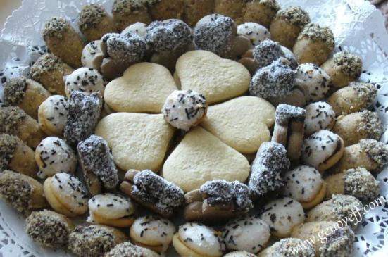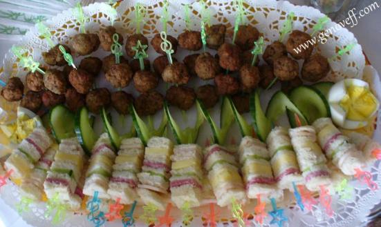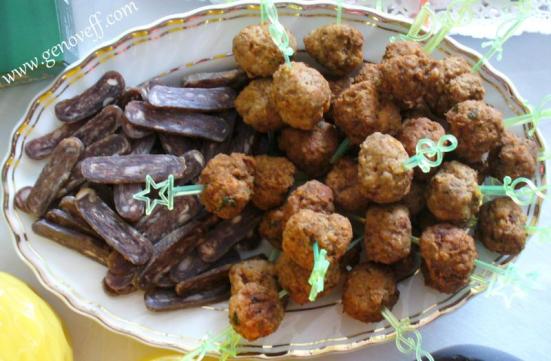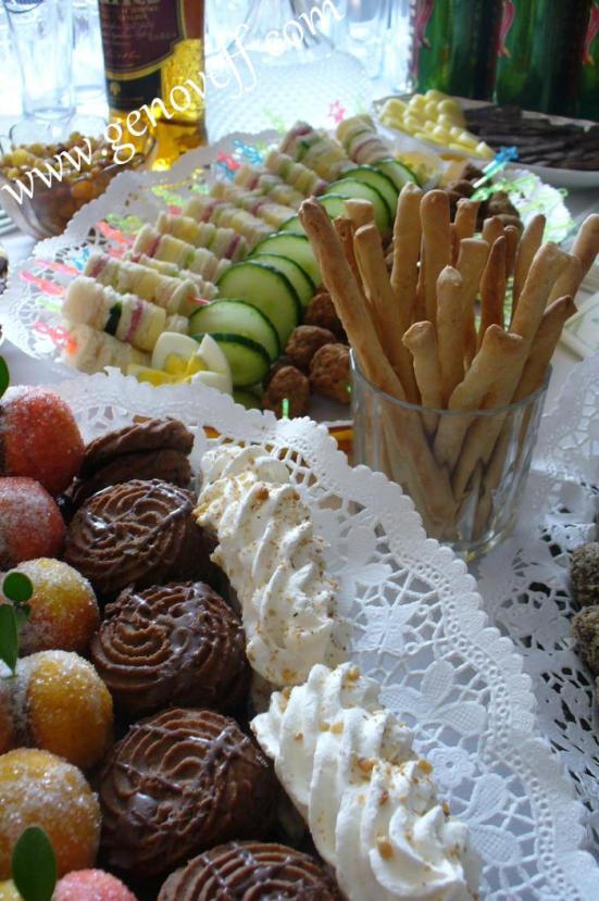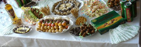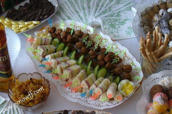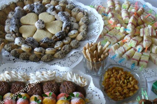 За този хубав повод ми се искаше да направя сватбени меденки с украса от моделираща маса представляващи триетажна торта и сватбена рокля. Малки кокетни сладки. Но сестра ми не пожела. Поиска си меденки с формата на сърца и цветя и то неукрасени. Направих медени сладки с формичките които тя си избра. И не ги украсих. Спазих изискването и, колкото и да не ми се искаше да е това. Ден преди събитието не бях на работа и бях решила да помогна в приготовленията за почерпката у дома. Меденките както и другите сладки бяха готови предварително. Можеше да се каже, че оставаше да се приготви солената част. Мама щеше да направи мини кюфтенца, а аз парти хапките. Двете запретнахме ръкави в кухнята и след шест часа, че и малко повече хапките и кюфтенцата бяха готови. След това реших да направя домашни солети и замесих набързо тесто. Определено те не ми отнеха време в сравнение с хапките :). Станаха много бързо. Правех ги за първи път и останах приятно изненадана, както и от мама. Толкова ги хареса, че ми беше трудно да ги опазя :). Е-е, стига съм се обяснявала, а да ви покажа с няколко снимки какво свършихме, като нареждането на платата и декорирането им направихме в деня на сватбата. Беше ни много притеснено и бързахме притиснати от времето. Но пък за това се включиха още чифт ръце, които освен това, направиха и украсата в дома ни. Половинката пък не спря да пренася храната и напитките, и да помага с каквото може. После пък още едни сръчни ръце се погрижиха за прическите ни. Както се казва всеки с хобито си :).